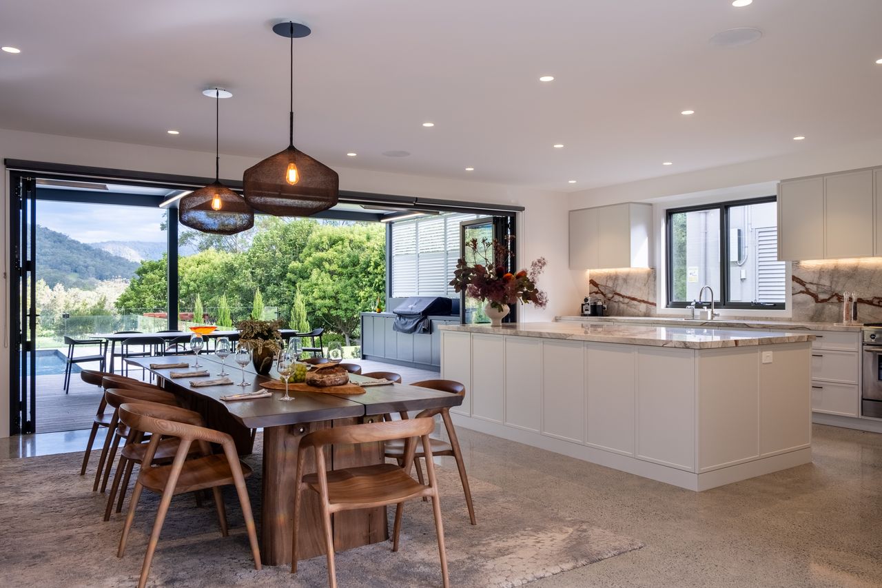 The central pod has a generous living and dining area divided by a two-way open fireplace and an entertainer's kitchen with an island bench, two dishwashers, a large oven and a Nespresso coffee machine! There is a Zip Tap that provides instant filtered boiling and chilled water. The living and dining area has floor to ceiling bifold glass doors that open out to the entertaining area overlooking the swimming pool.