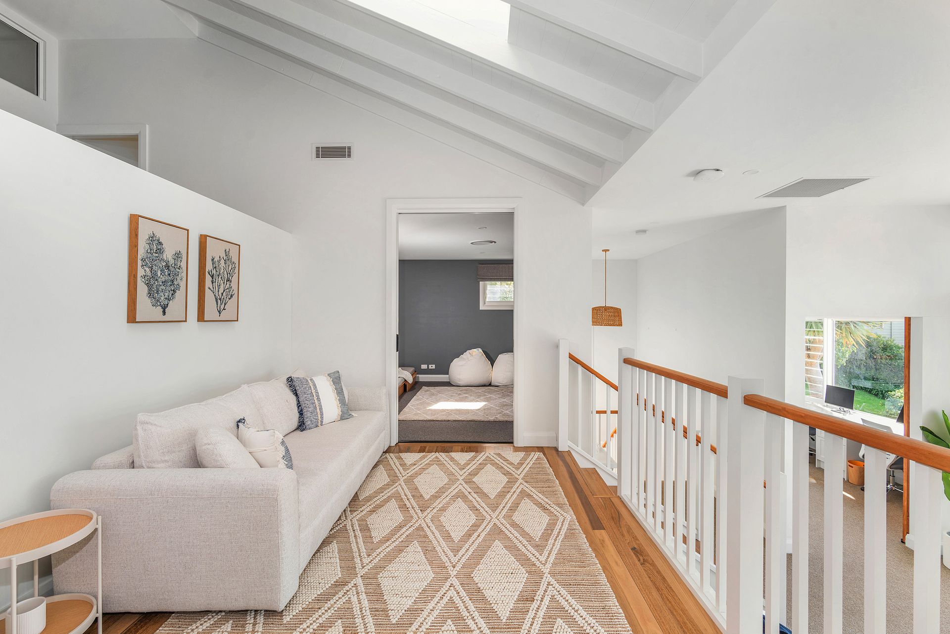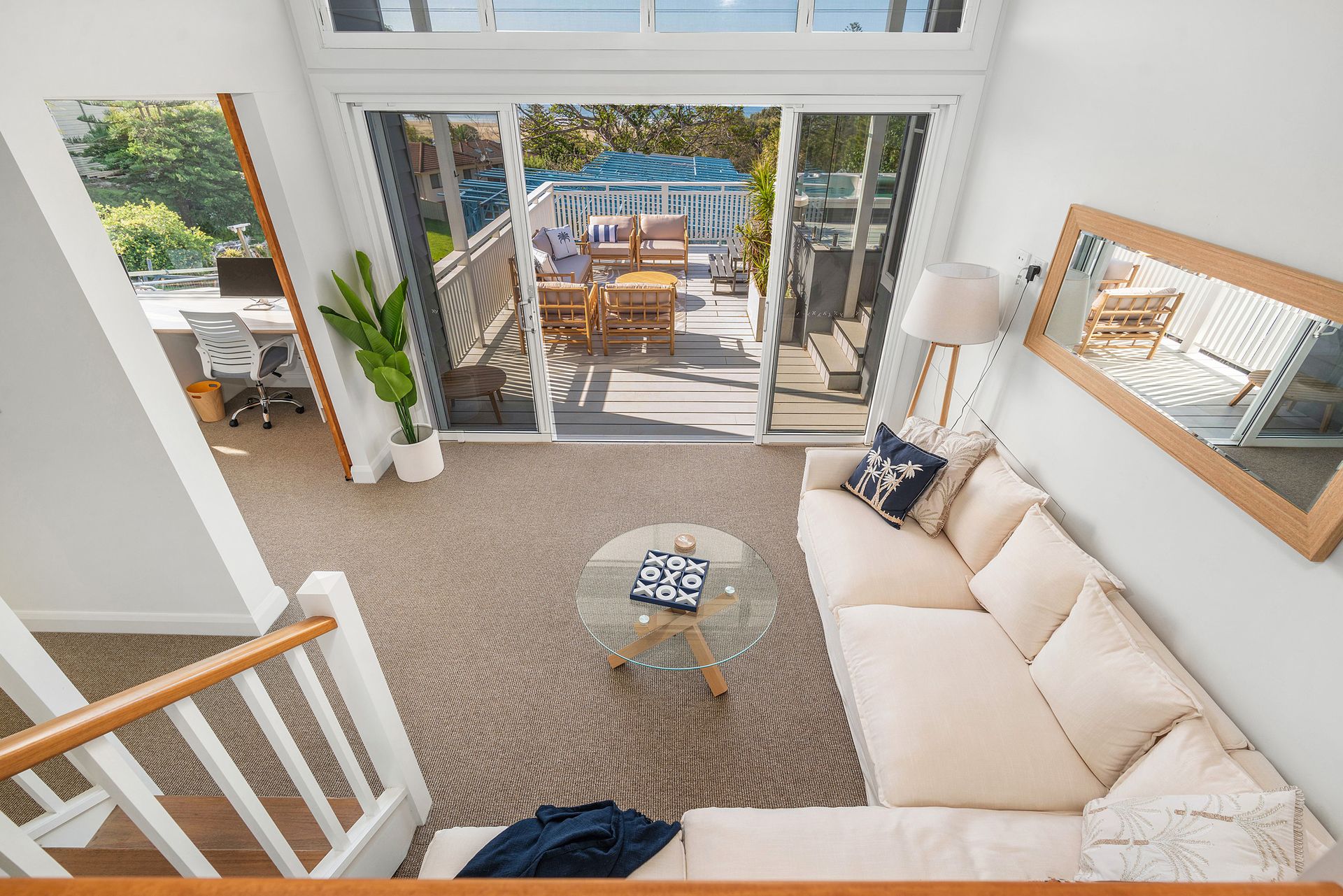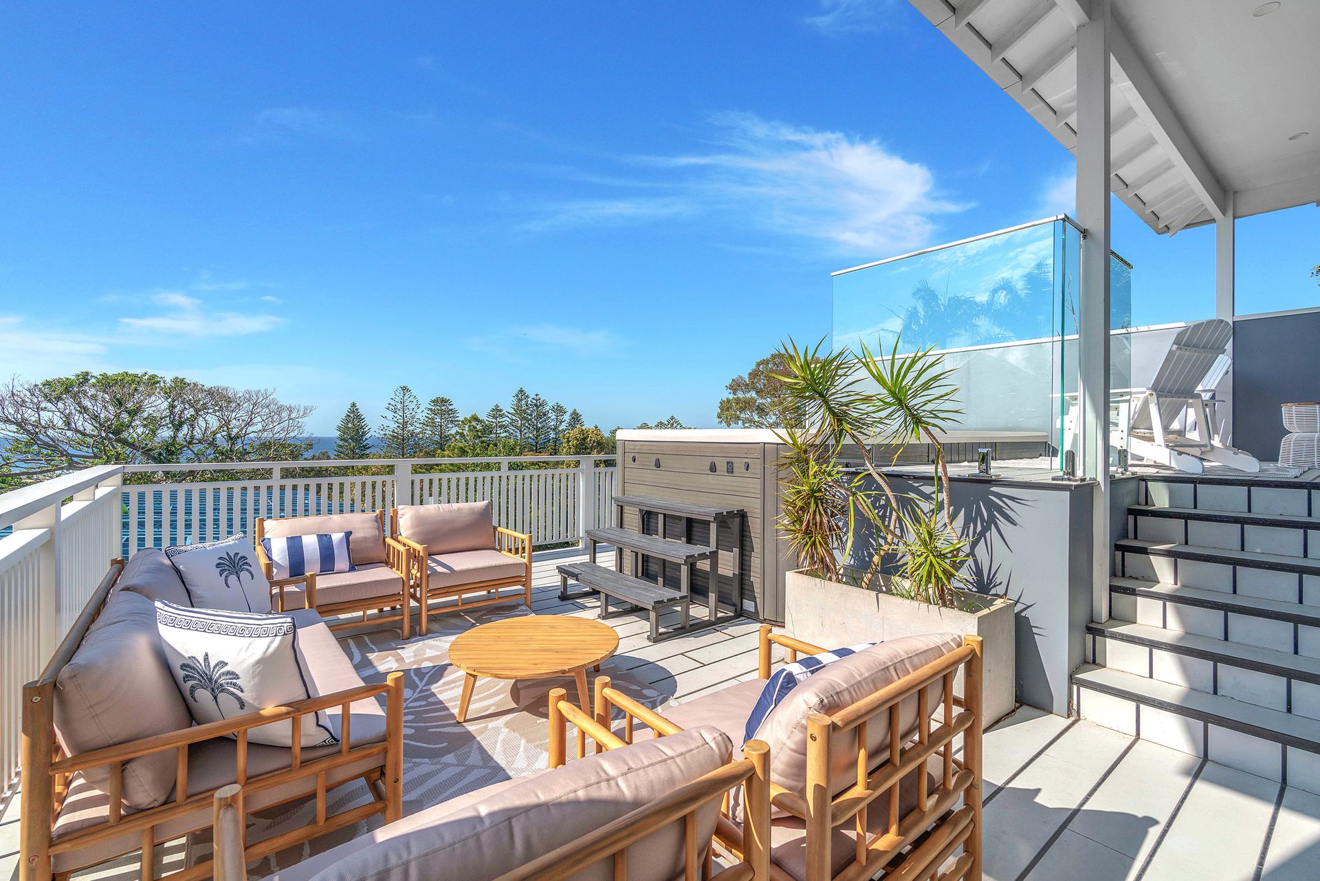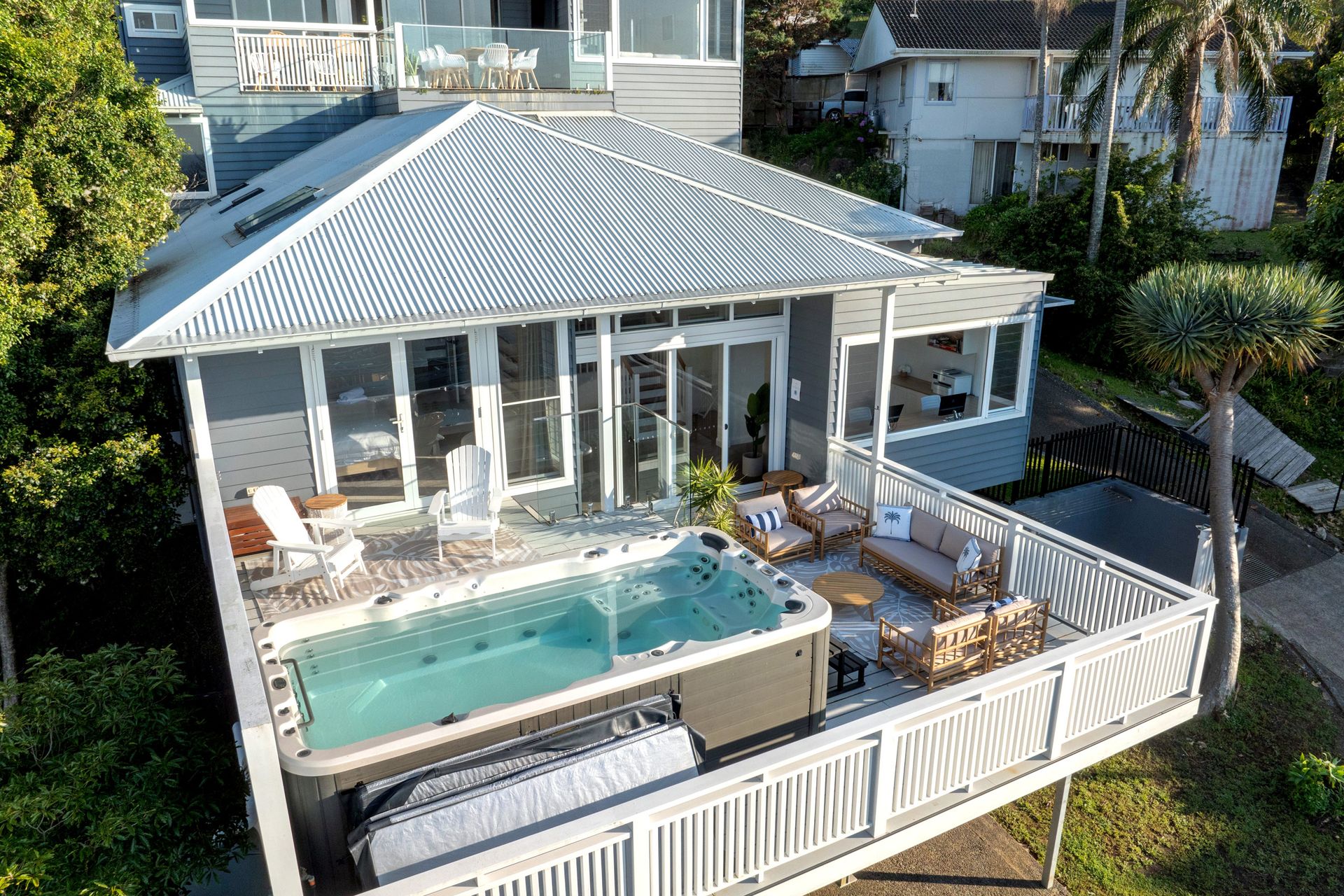Seven Mile View is for those who want beachside luxury. This house boasts luxury fittings and appliances, multiple outdoor spaces with lounges and dining tables, as well as an outdoor TV & a swim spa! This expansive house is ideal for families and friends who need that extra space, or room for the kids to play. In addition to the office is a built in bench where the kids can use or recharge their devices. There is also a dedicated theatre room with 83" smart TV and surround sound system.