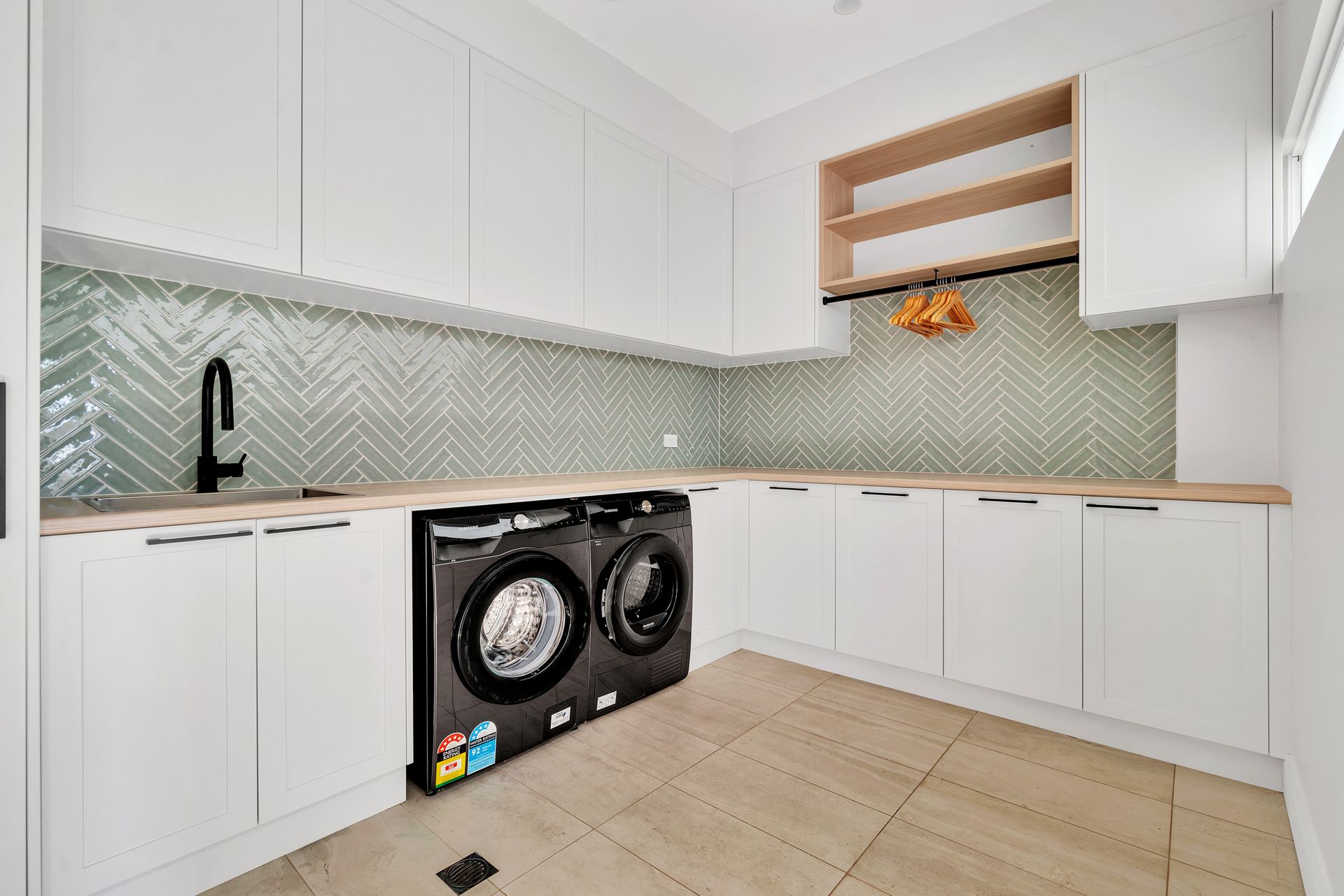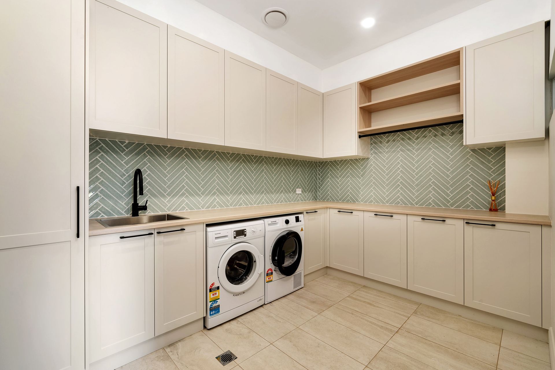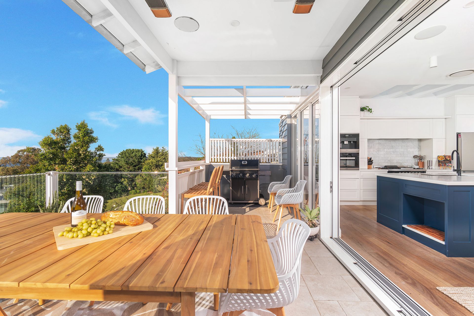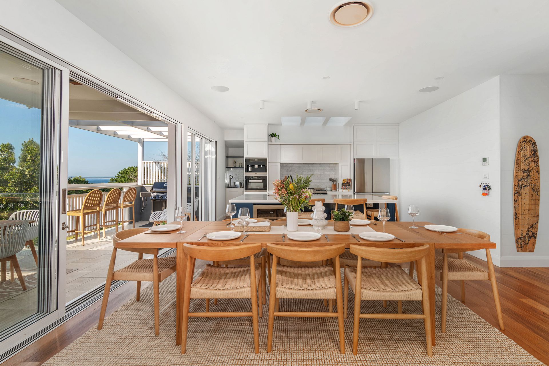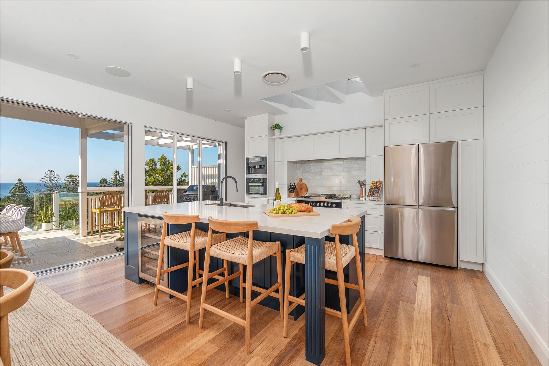 The modern kitchen is well equipped with bench seating at the island bench. The appliances include gas cooktop and hotplate, Miele oven, Miele microwave oven, knock-to-open Miele dishwasher, beverage fridge, soda stream and butlers pantry.