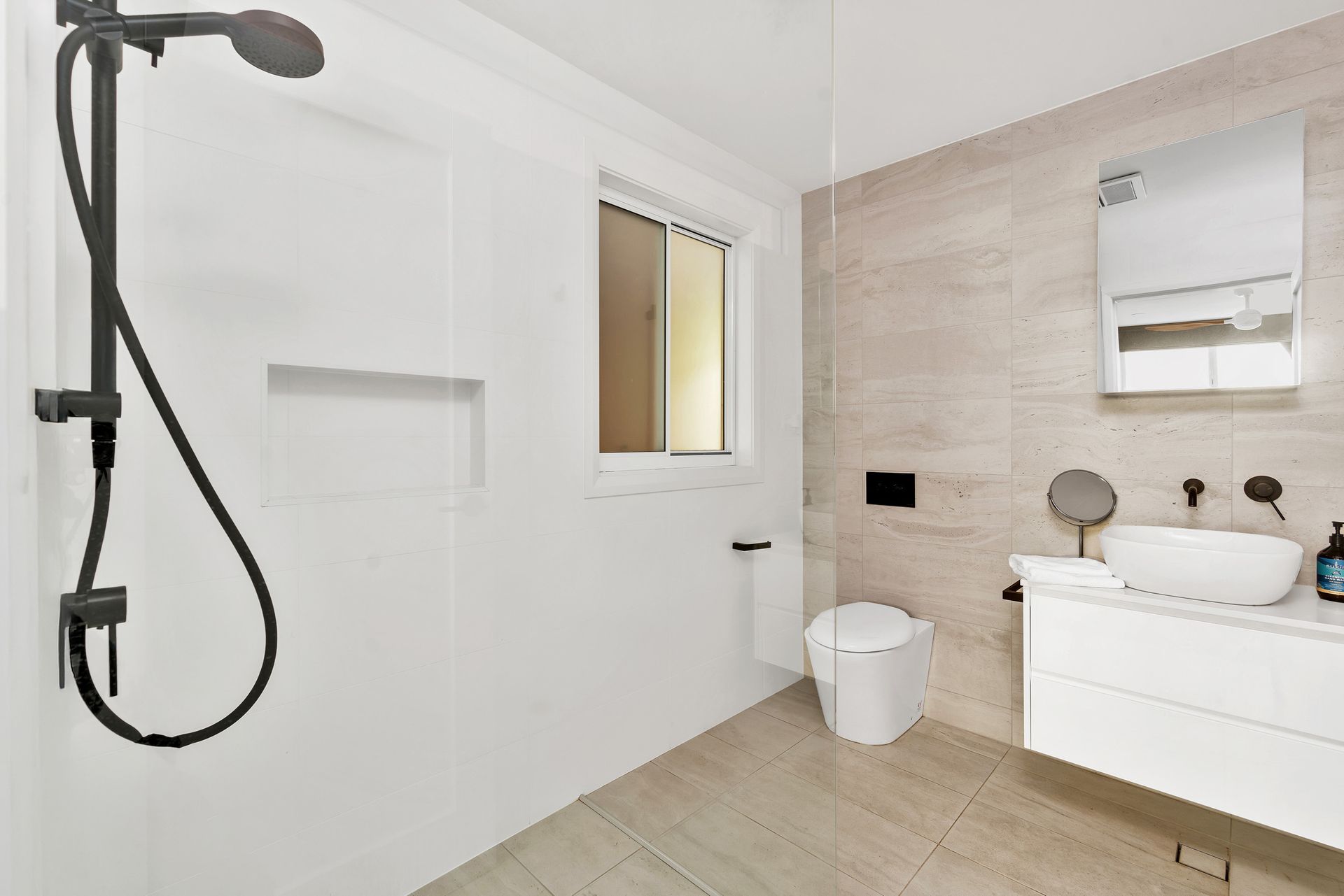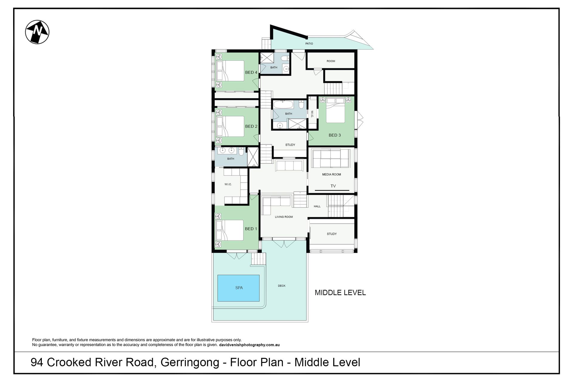 Seven Mile View is a 3 level house additionally split into a few separate areas on the Middle Level. The Upper Level is the entry level. On this level is the kitchen, dining, living area with gas fire place and smart TV, and a large balcony with BBQ and outdoor seating with an outdoor TV, and a powder room. The Middle Level has the bedrooms, theatre room with 98" Cinema TV and surround sound system, additional living room, desk area, and office. The swim spa is accessed from this level and the deck has outdoor seating. The master bedroom has a walk-in-robe and ensuite, bedrooms 2 and 3 share a Jack and Jill bathroom, and bedroom 4 has an ensuite. The laundry and mud room are located on the Lower Level.