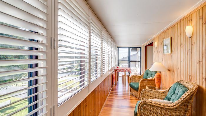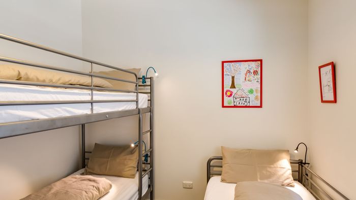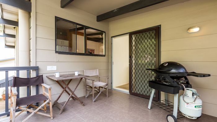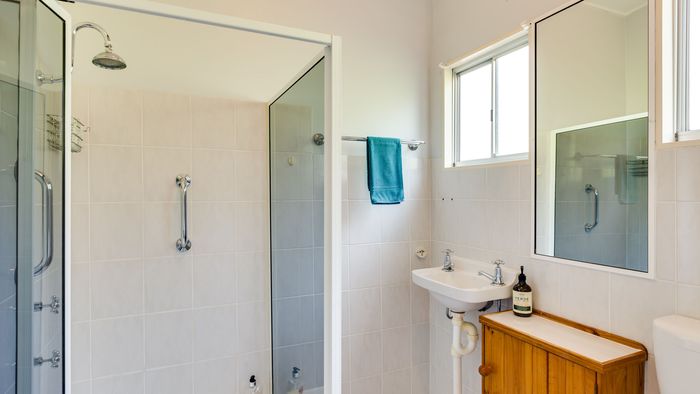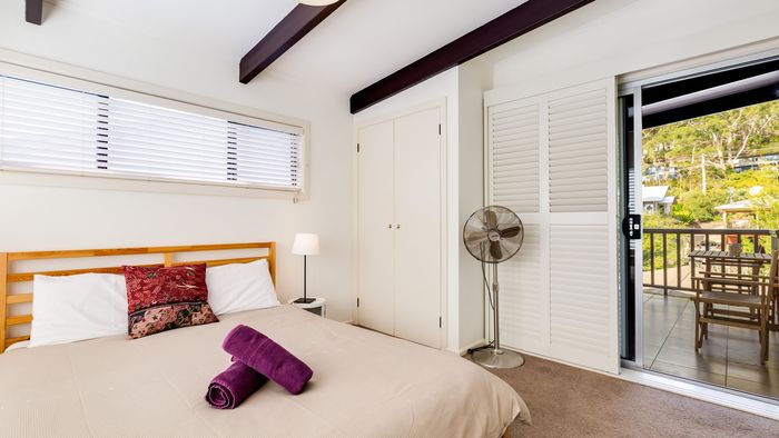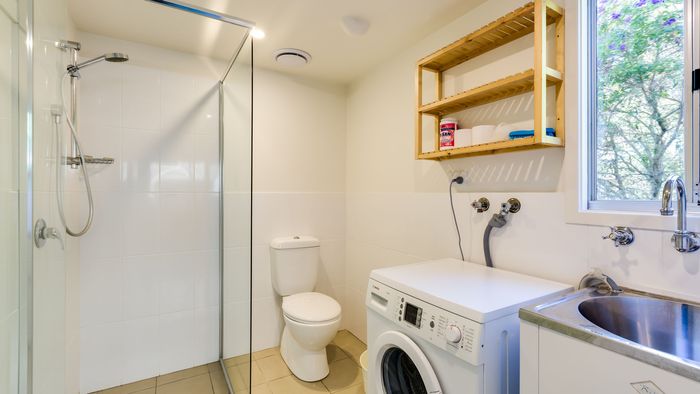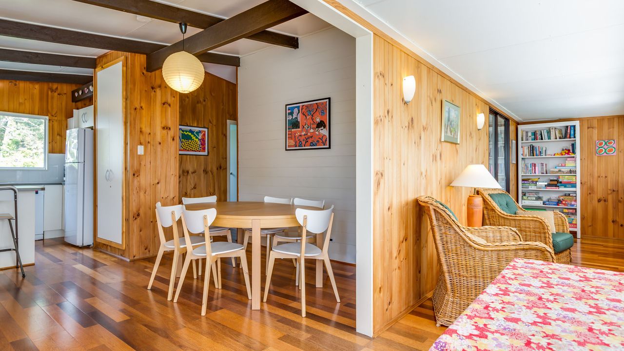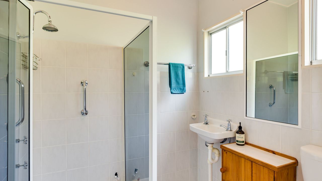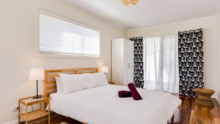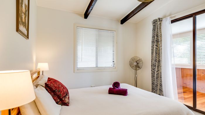 Shanti is a double storey home. The front door is on ground level and opens into a good sized lounge and tv area, with a door leading through to a queen bedroom. A shower, loo and laundry are also located on this level, near the rear door that leads out to the back garden. Upstairs the house has a dining room, kitchen, second shower and toilet,three bedrooms, and an internal sunroom / balcony. The main queen room has its own adjoining deck overlooking the back garden and the creek. There is then a second queen bedroom and a third bedroom with a bunk bed and single bed (sleeping three). The house is north facing with good natural light upstairs.