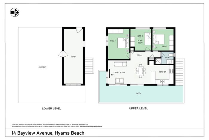 Summerdaze is set on one level with a full width deck, kitchen and living room at the front of the house, and three bedrooms plus the shared bathroom (shower and toilet) at the back of the house. The house is set up one level from the parking, and is accessed via a flight of external stairs. There is not internal stair access. This is seen in the photos.