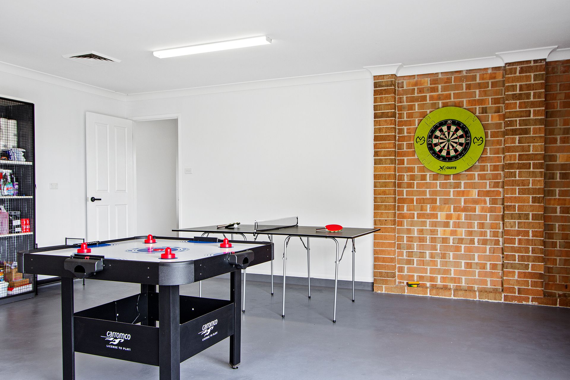The Great White is a two-storey home with the main living areas downstairs. Downstairs features full kitchen, dining area, casual dining area, and two living areas. One part of the garage has been converted to a games room with table tennis table, air hockey table and darts. The four bedrooms (one with ensuite) and additional bathroom is located upstairs where you will also find an additional living area with arcade machine! There are three TVs - two in the main living areas and one in the master bedroom.