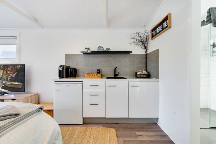 The Hen's Den is a single room studio with kitchenette and ensuite (shower and toilet) and TV. The bed is king size, and the studio has a small kitchenette with kettle and sink.