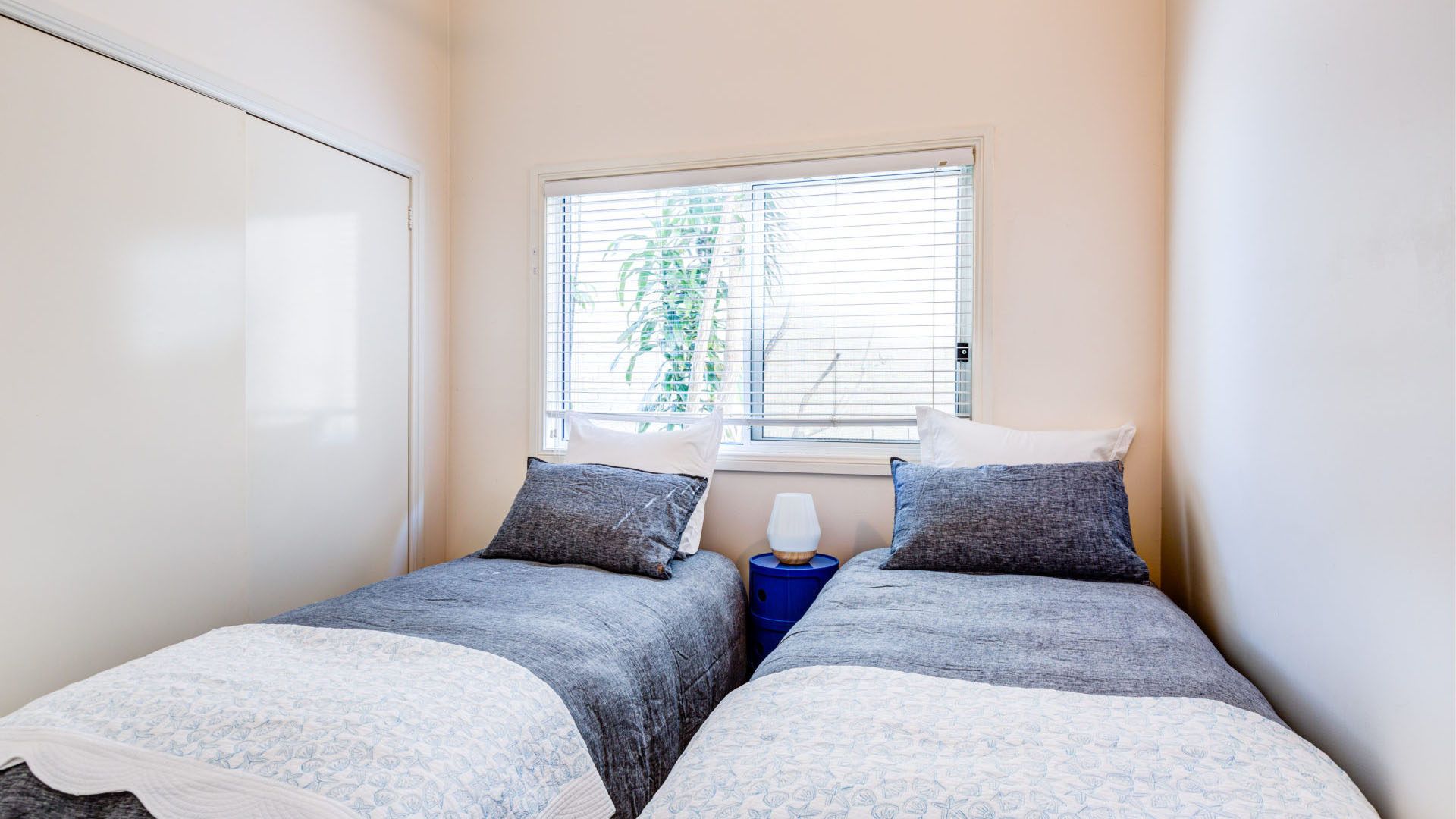 Mid level - this level has two semi-partitioned bedrooms, with a king single in each and two king single trundles underneath them both. There is also a shared bathroom with bath tub and shower, another good sized living area, and an internal laundry. A second deck adjoins the one bedroom and the living area.