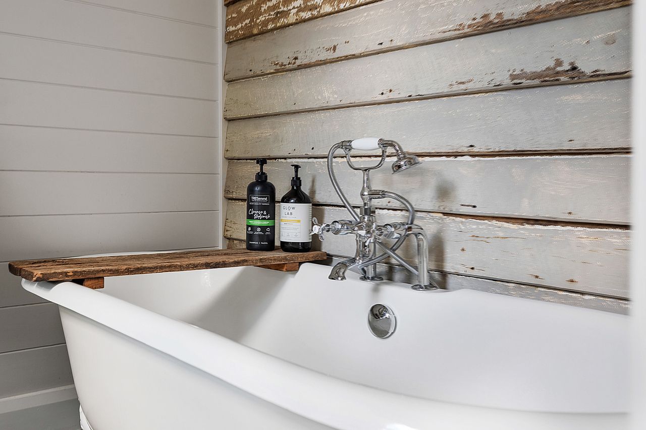 The home is all on one level and has 2 queen bedrooms, a bunk room with 2 bunks (great for 4 kids!), 2 bathrooms (one with a claw foot cast iron bath), a kitchen and laundry, and of course a dining and living room. The home effortlessly flows out onto the large deck, spa area, and lovely lawns that slope down to the private river frontage.
