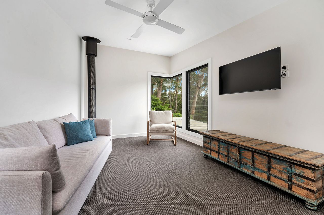 The Twig has multiple outdoor spaces where guests can enjoy outdoor living. A large covered deck is accessible off the combined living and kitchen area, and has an outdoor dining table and BBQ which is perfect for entertaining in all weather. Enjoy sitting under the stars around the fire pit! The grassed backyard is fence and ideal for kids to enjoy playing games. The master suite also has a private deck.