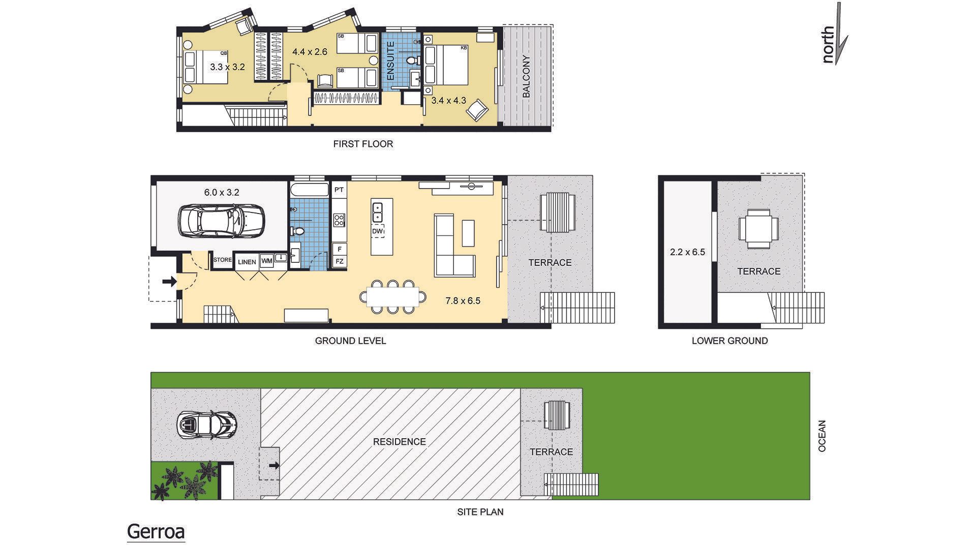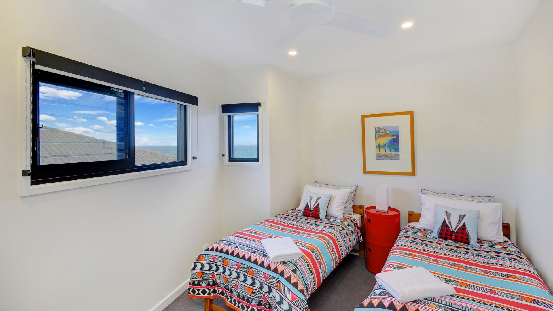Upstairs there are three bedrooms, a king bedroom, a queen bedroom and a twin bedroom with two single beds. The king bedroom has a private balcony with a view out to the ocean plus an ensuite bathroom.