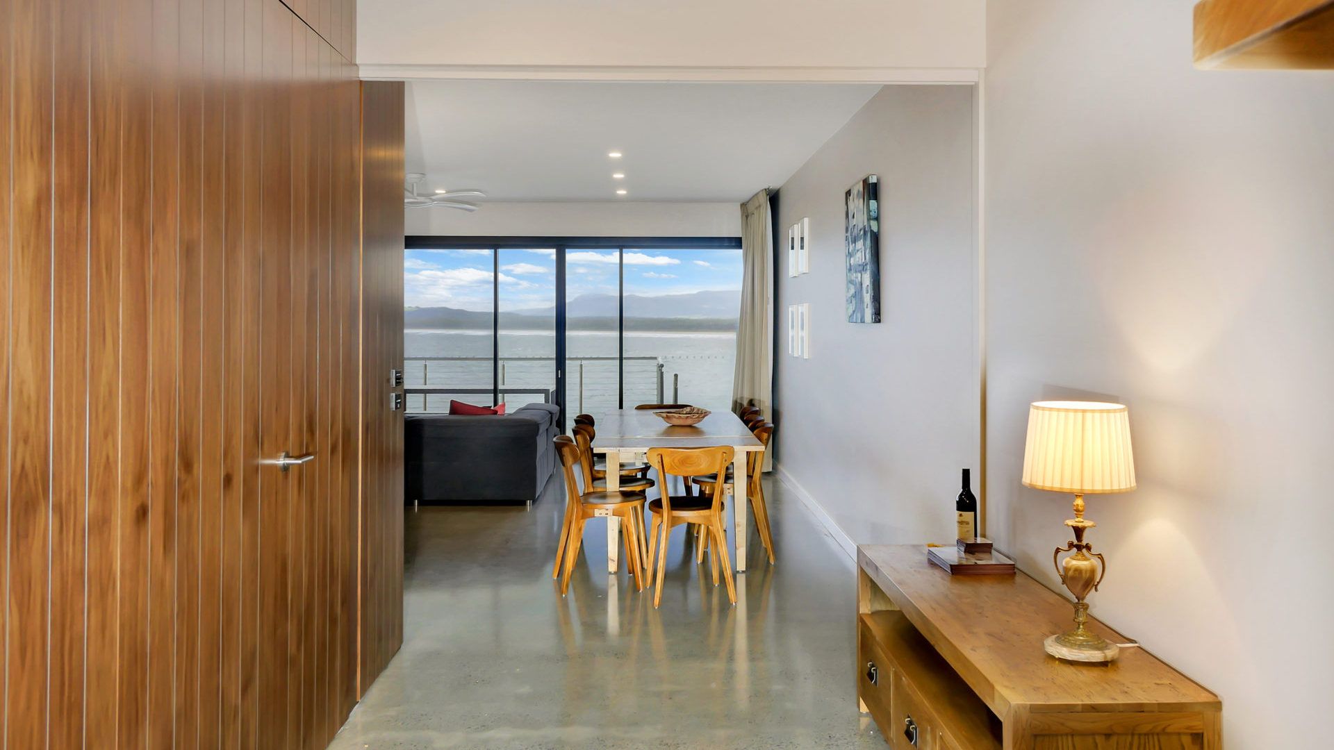 Downstairs is the open plan kitchen/dining and lounge room with polished concrete flooring running smoothly through the kitchen, dining and lounge areas. A breakfast bar seats four and the wooden dining table seats eight. The lounge area has comfy seating, a large flat screen TV and coffee table.The kitchen is full equipped with a dishwasher, microwave, oven and electric hotplate, Coffee machine (some capsules provided), double fridge/freezer with ice water system.There is also a downstairs bathroom with shower, bath, vanity, mirror, and toilet.