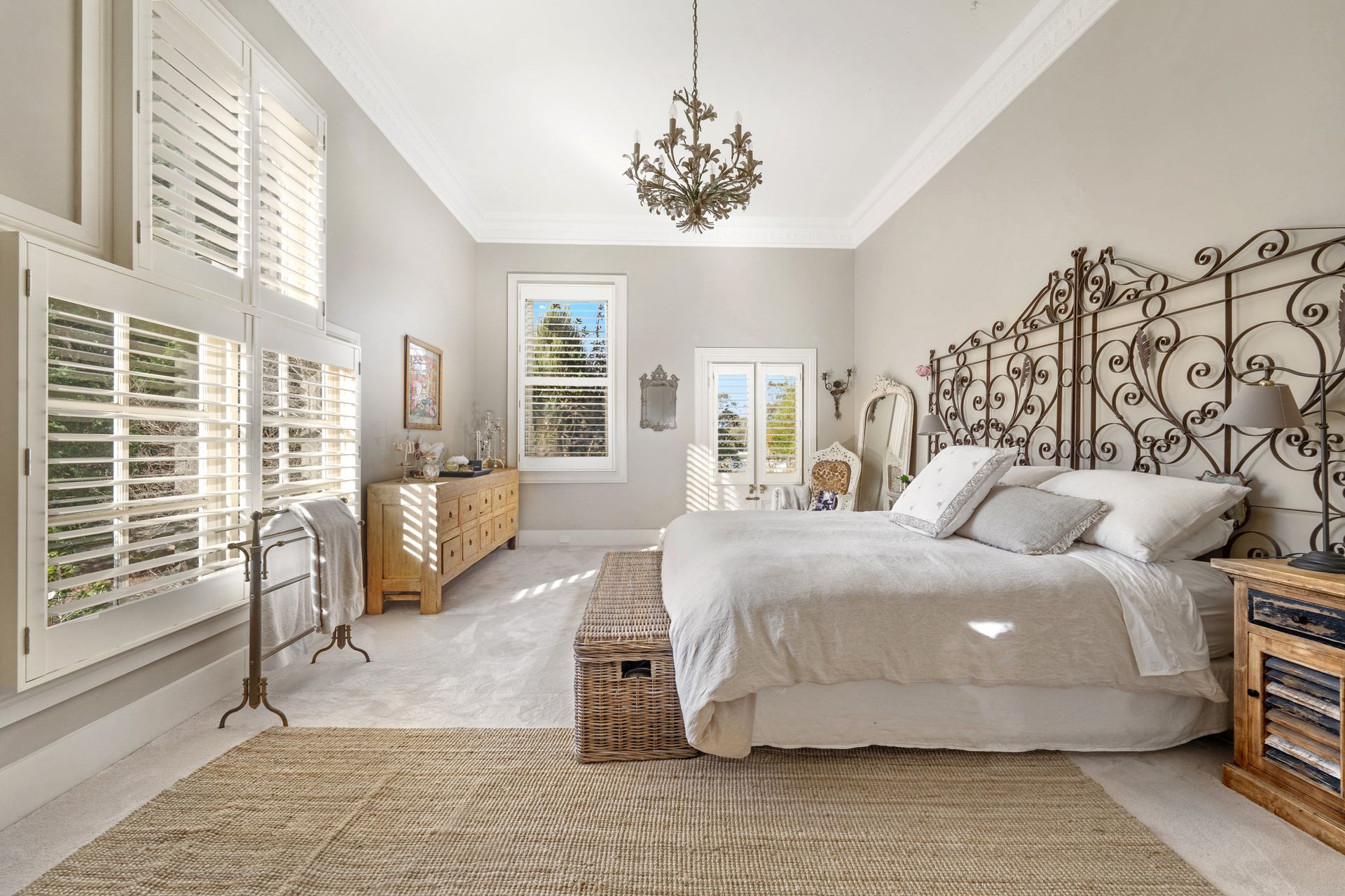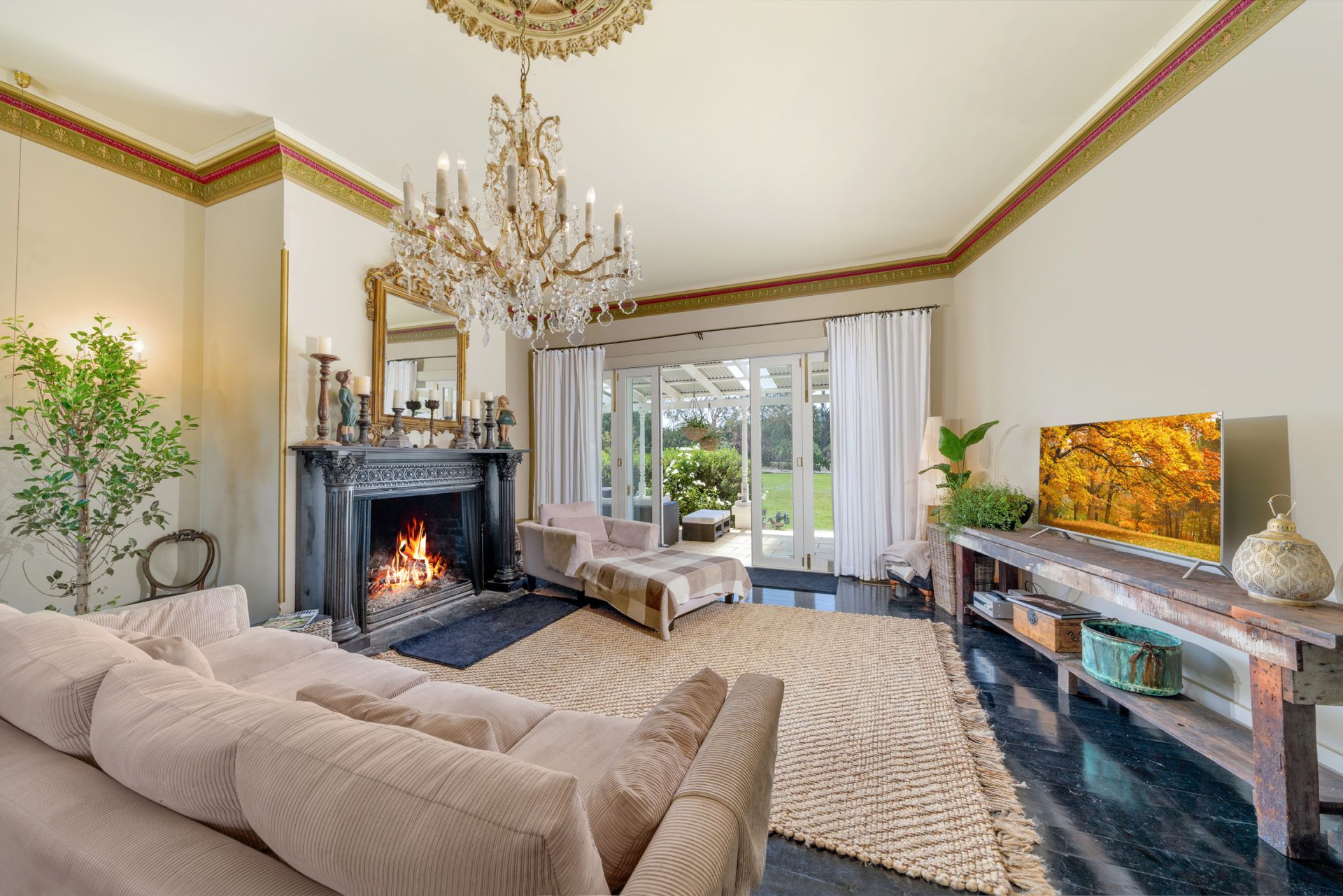 A long private 50m driveway reveals this beautiful property with manicured lawns and fountain. Enter through the ornate lead light doorway and you are greeted by the formal parlour room. In the main house there are 3 bedrooms, a Queen, a Queen with 2 singles and a master bedroom with a King. Shared by these bedrooms there is a truly exceptional family bathroom; an entirely open travertine tiled wet room with a feature reclaimed stained glass window from the Carrington Hotel, ornamental fireplace and a freestanding claw and ball bathtub. There is also a laundry in this section of the home with a washer, dryer, toilet and basin.