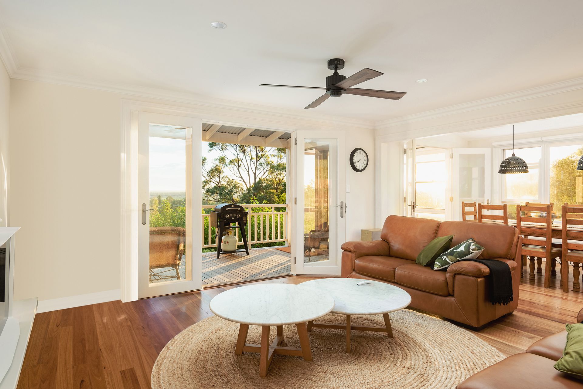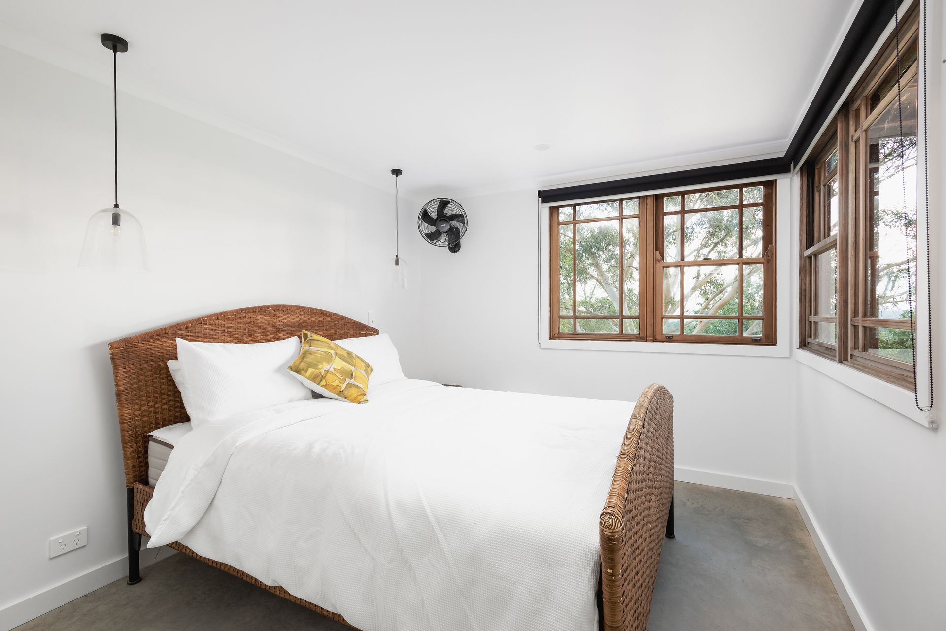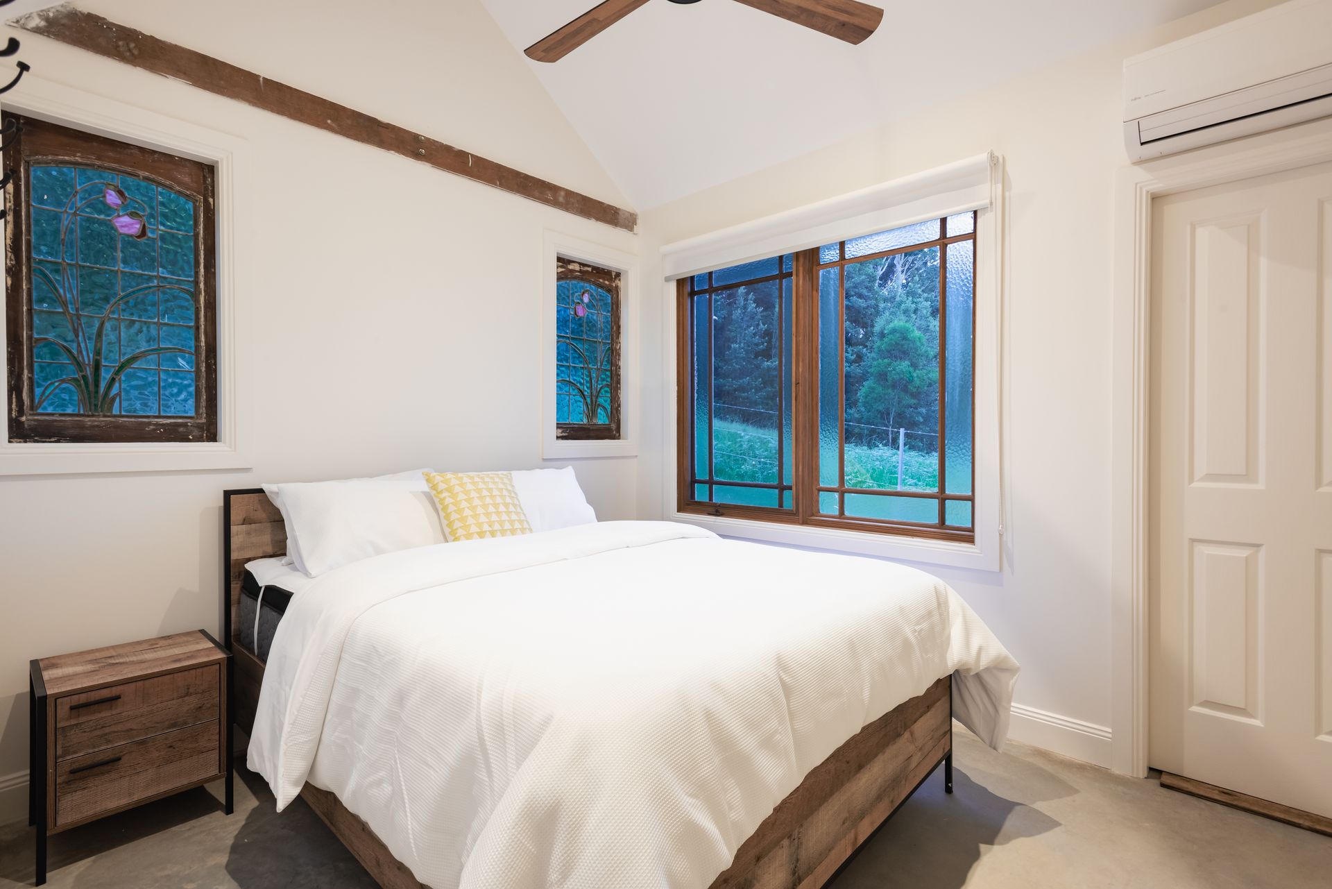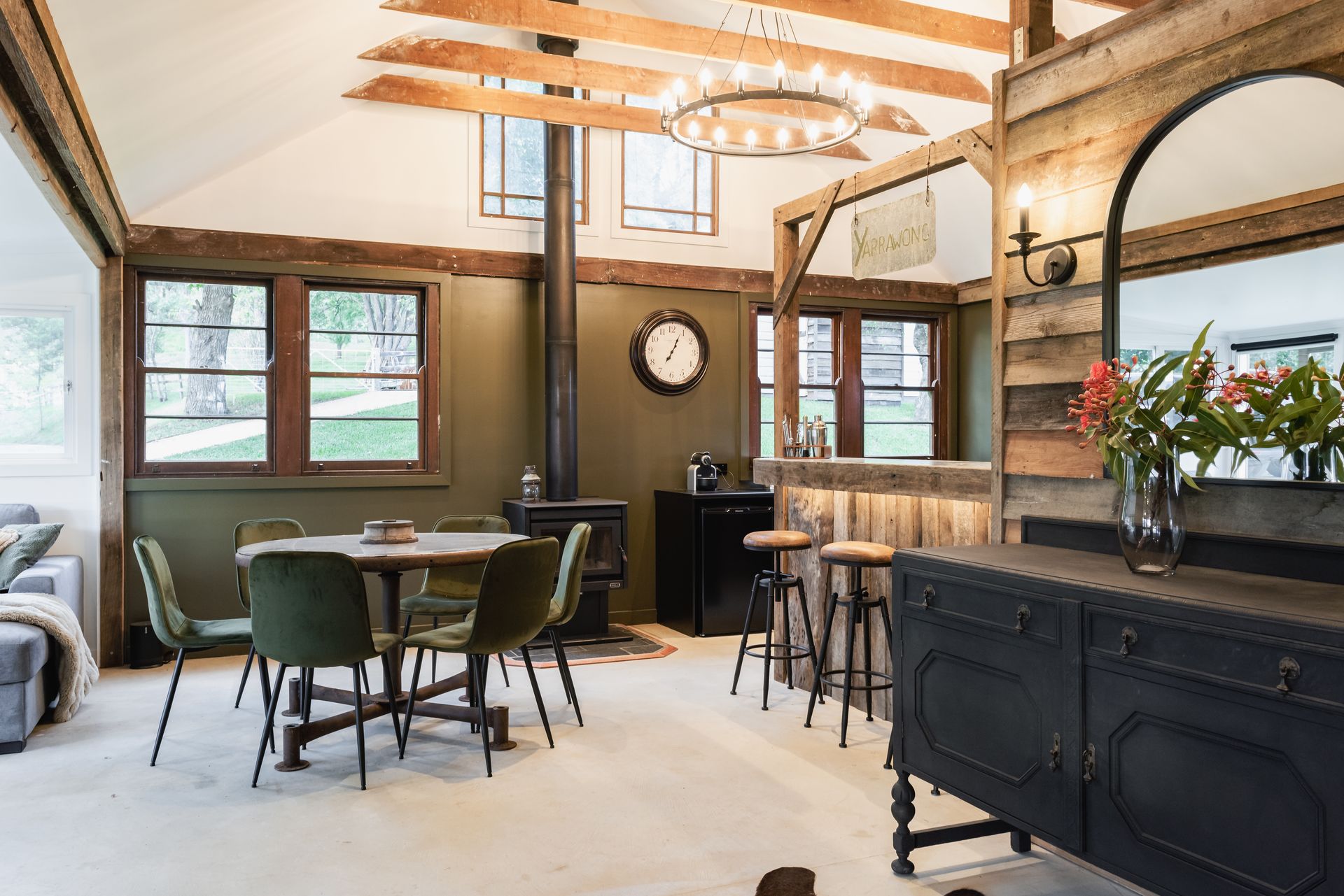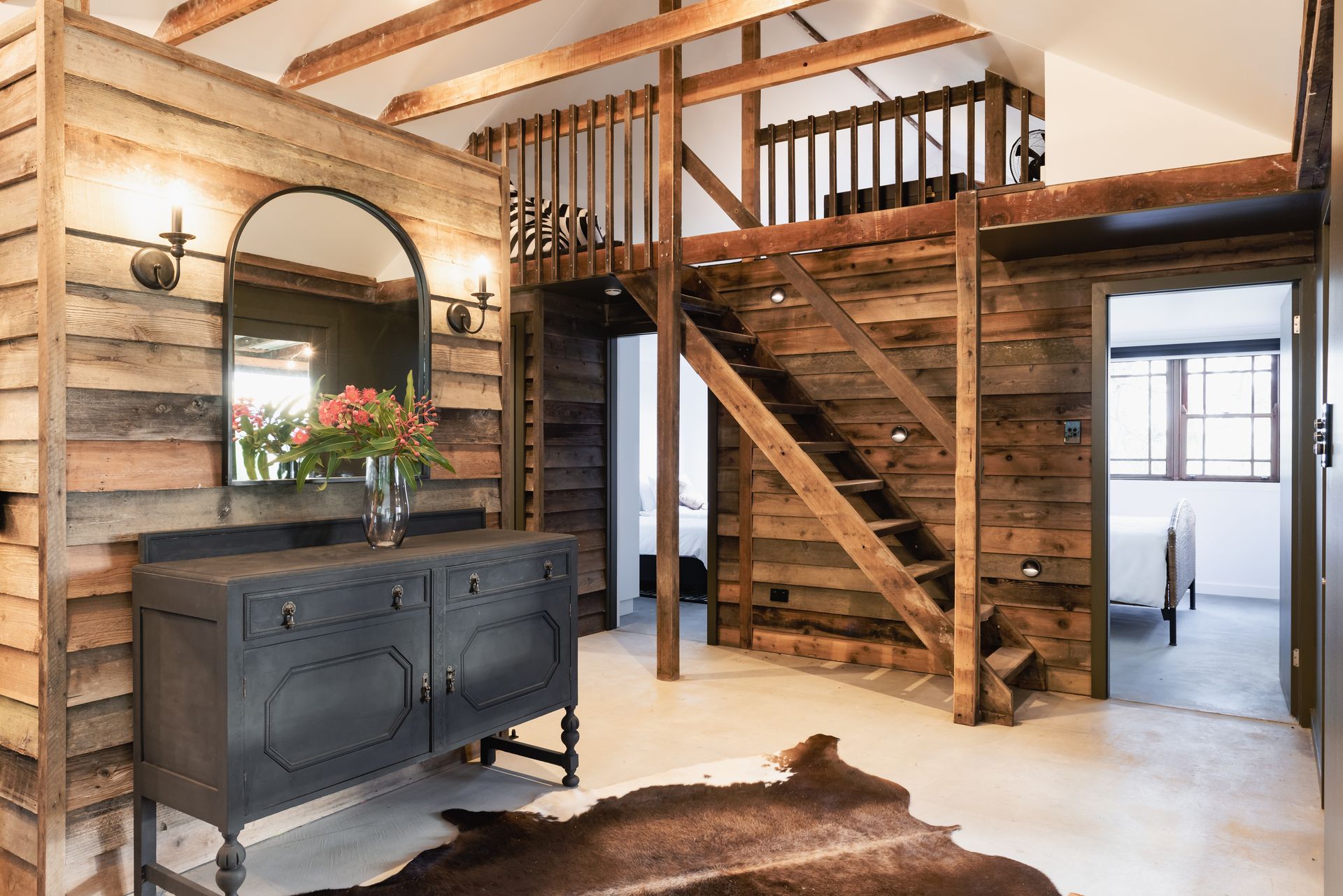 The Barn: Just across the lawn is The Barn - a self contained rustic dwelling sleeping 6. Downstairs features a living room with television and dining table, a bar for casual eating, 1 bathroom with shower and toilet, 1 powder room, and 2 bedrooms (1 queen, 2 single). Upstairs features a 2 bed loft (single beds). The covered outdoor terrace offers a picnic table where you can enjoy a long lunch in the fresh rural air. Inclusions: Nespresso coffee pod machine, bar fridge, kettle, toaster, smart tv, Bluetooth speaker, reverse cycle air conditioner and ceiling fan.