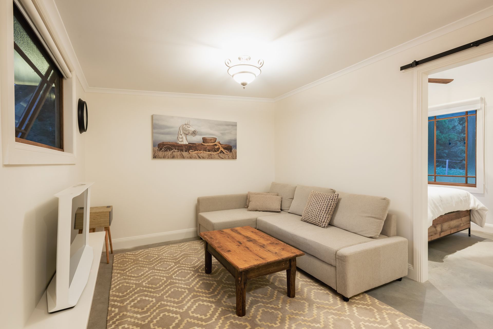 The Stable: A short stroll up the gravel path is The Stable, which features a living room with television, and a bedroom with queen bed. The bedroom has an ensuite with shower and toilet. In addition, there is a traditional outdoor Australian toilet! Inclusions: kettle, toaster, bar fridge, smart tv, Bluetooth speaker, reverse cycle air conditioner and ceiling fan.